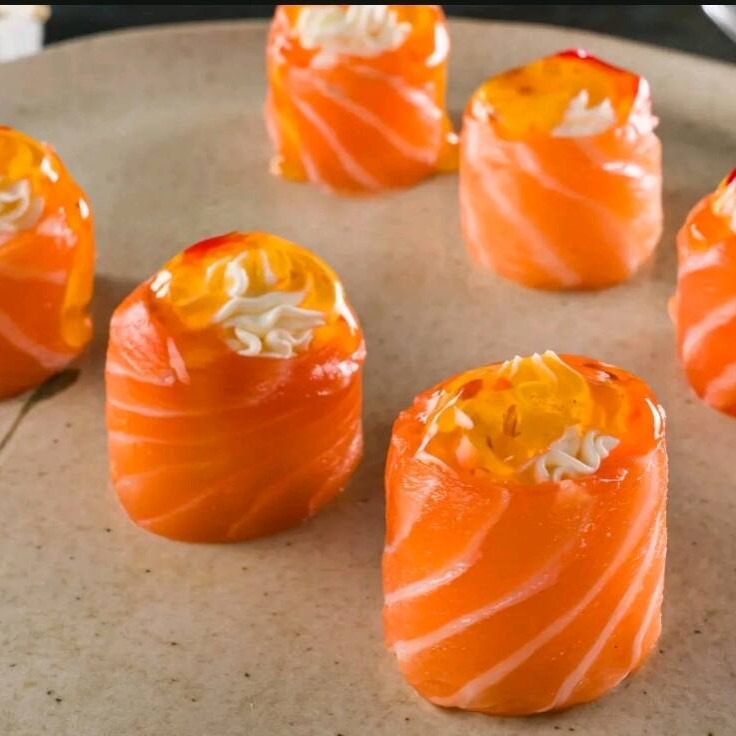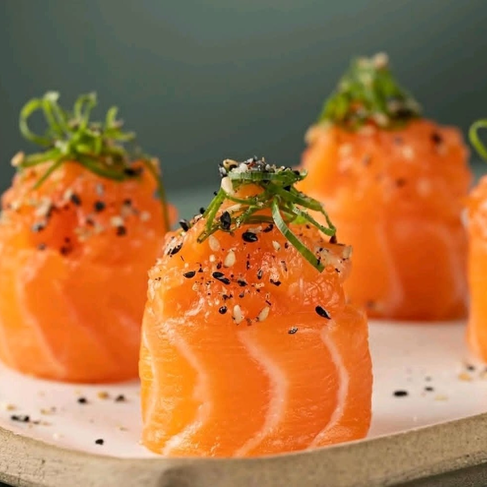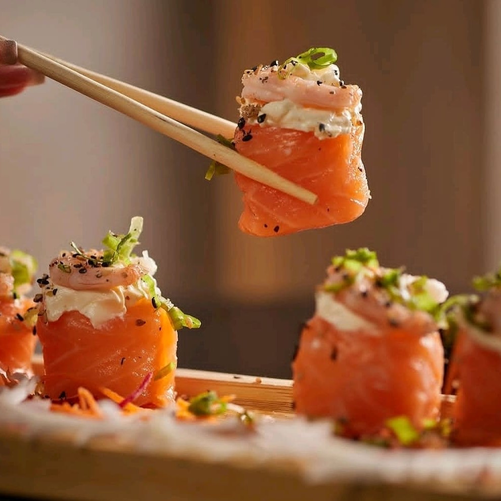 Enrolado de arroz por fora recheado com salmão grelhado finalizado com cream chesse tarê raspar de limão siciliano e cebolinha