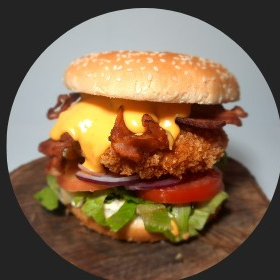 Peito de frango empanado, cheddar cremoso, bacon, alface, tomate e molho da casa.