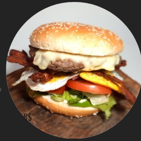 Pão, hambúrguer bovino 150g, queijo, ovo, alface, tomate e molho da casa.
