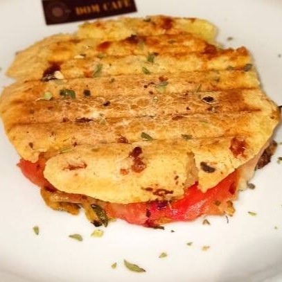 Pão de queijo tostado na chapa, recheado de queijo presunto tomate e orégano.