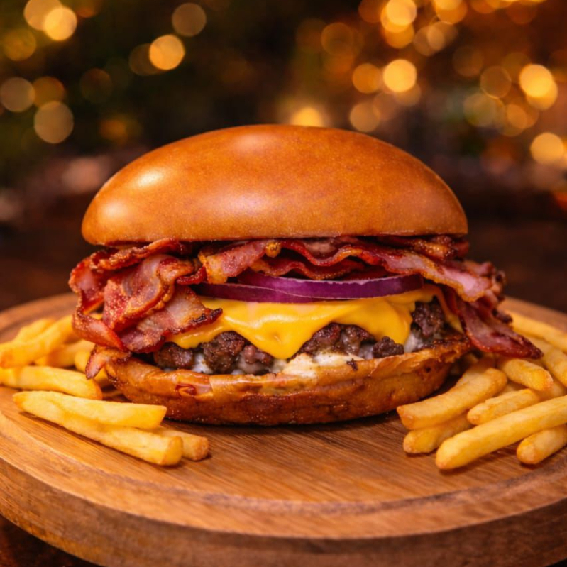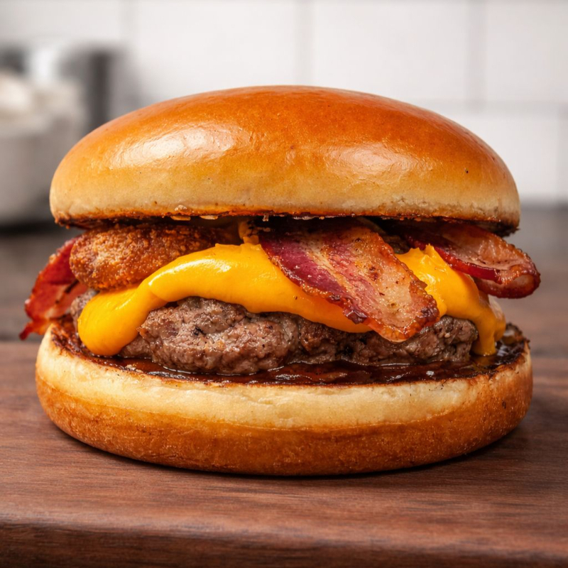 Pão brioche, carne bovina 150g, cheddar cremoso, bacon, onion rings, molho bbq.