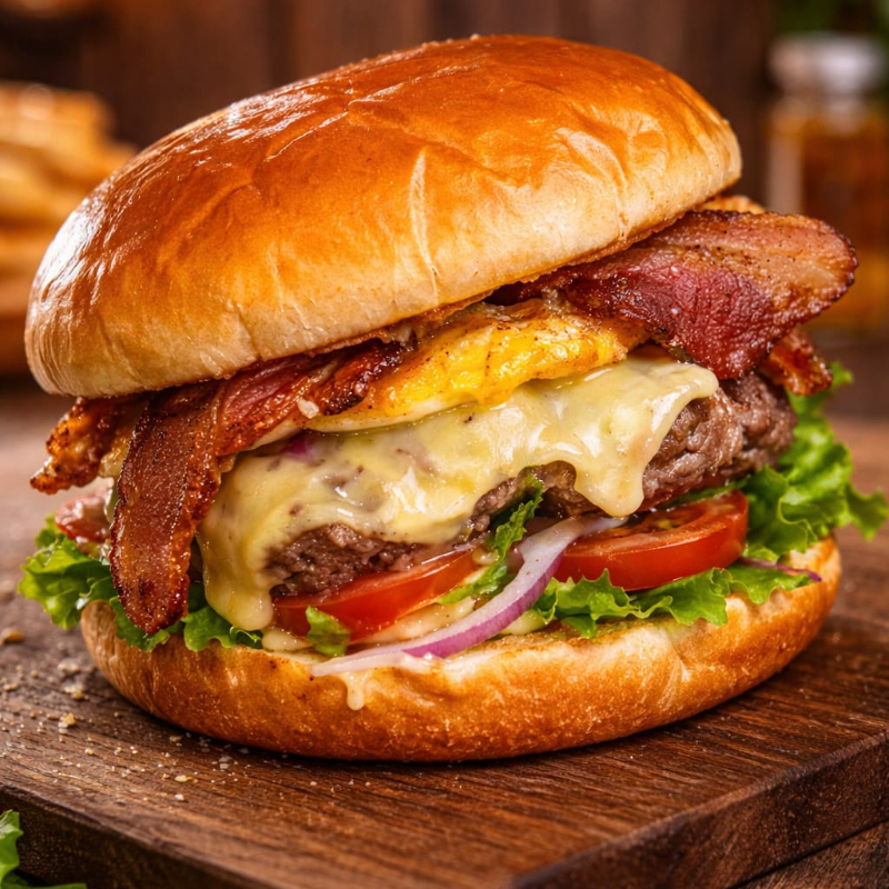Pão brioche, carne bovina 150g, queijo prato, bacon, ovo, alface, tomate, cebola roxa, picles, maionese especial.