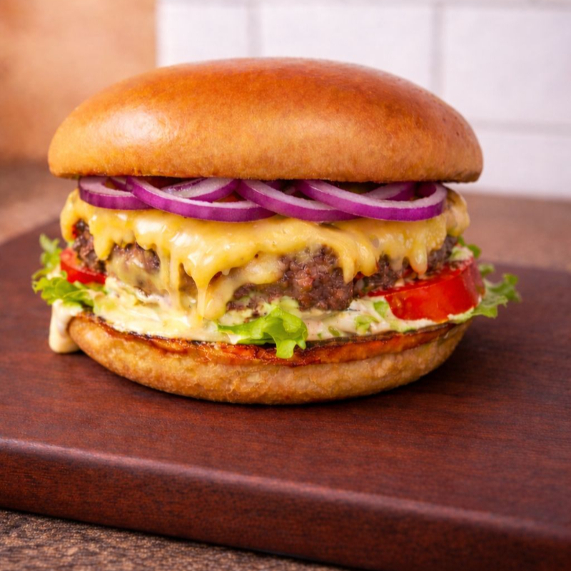 Pão brioche, carne bovina 150g, queijo prato, alface, tomate, cebola roxa, maionese especial.