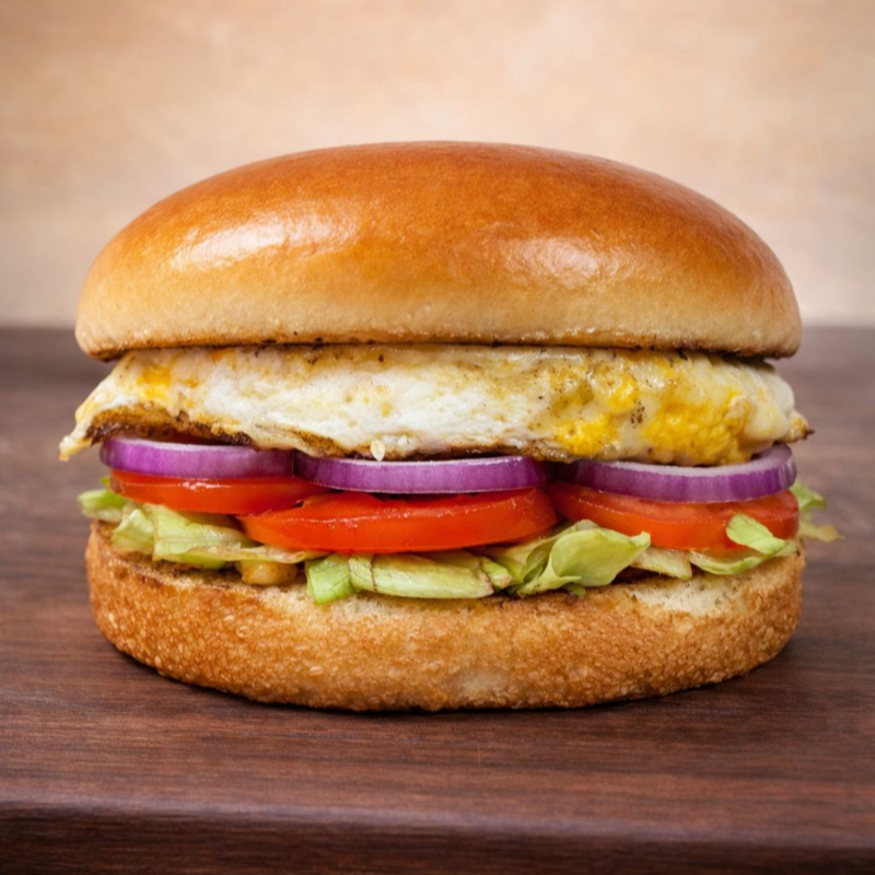 Pão brioche, hambúrguer de ovo, queijo prato, alface, tomate, cebola roxa, picles, maionese especial.