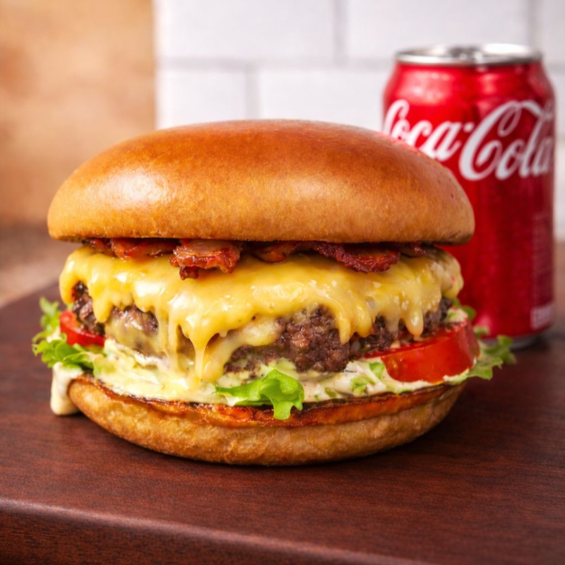 Pão brioche, carne bovina 150g, queijo prato, bacon, alface, tomate, cebola roxa, picles, maionese especial.