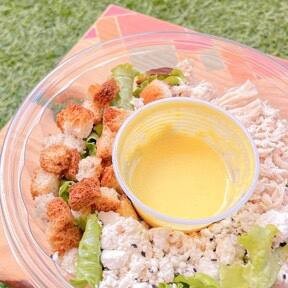 Uma deliciosa versão natureba e fit especial da clássica salada caesar, com: Mix de alfaces, peito de frango frango levemente desfiado, nosso patê de ricota cremoso e croutons (torradinhas) assadas ao alho. . *Contém lactose* . Valor calórico estimado da salada P (300g): 344kcal - sem o molho.