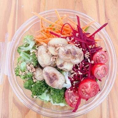 Nossa opção vegana, deliciosa, cheia de ingredientes selecionados (nada de origem animal) para dar o máximo de sabor: mix de folhas, brócolis cozido, batata doce rústica, cenoura e beterraba raladas manualmente, tomate e bacon vegetal para finalizar este prato saudável. . *Sem glúten* **Zero lactose** ***Vegana*** . Valor calórico estimado para salada P (300g): 213kcal - sem o molho.