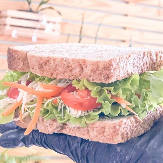 Delicioso sanduíche natural em sua melhor versão: Pão de forma, alface, frango desfiado, tomate cereja e um delicioso molho de alho para finalizar!