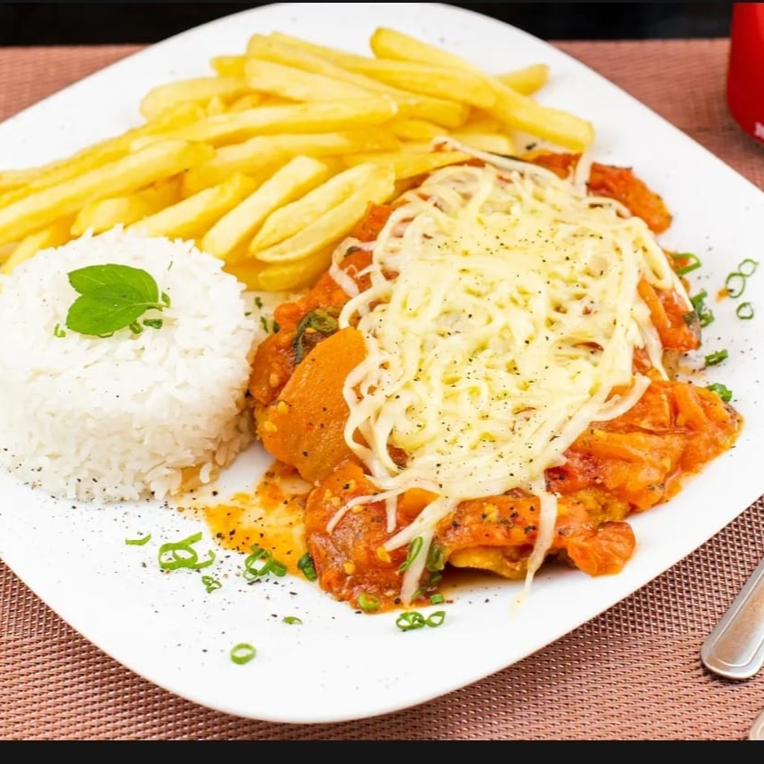 Acompanha arroz soltinho, feijão, fritas e Salada ...