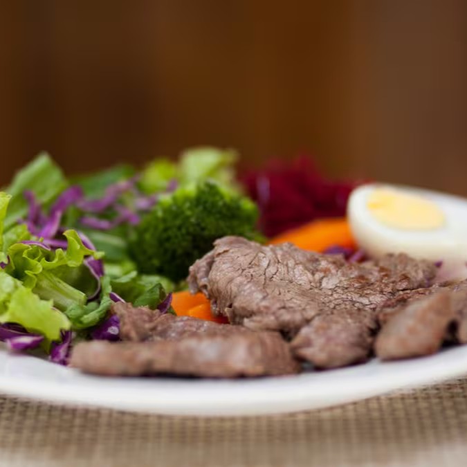 Suculento Filé Mignon Grelhado no ponto certo, servido com um mix colorido de legumes no vapor, salada fresca, arroz soltinho e feijão bem temperado.