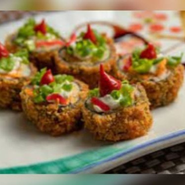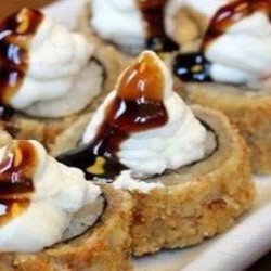 Enroladinhos de salmão recheado de arroz, cream cheese e camarão empanado na farinha panko.