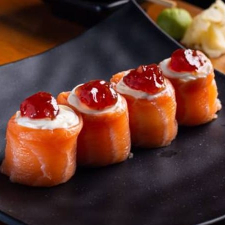 Enroladinhos de salmão recheado de arroz, cream cheese e geleia.