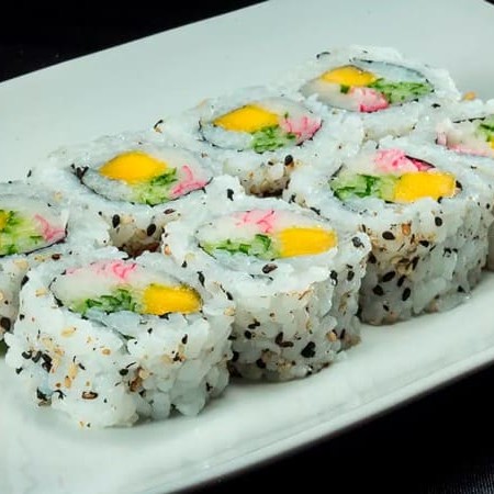 Recheado com arroz, manga, kani e pepino. Além de suculento e bem recheado, a cada mordida se torna mais especial.