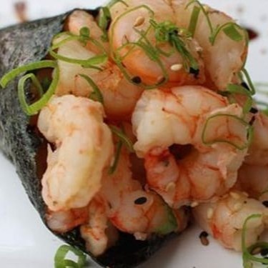 Arroz, camarão empanado na panko, cream cheese e cebolinha .