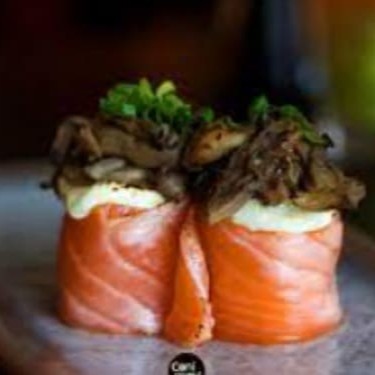 Enroladinhos de salmão recheado de arroz, cream cheese e shimeji.
