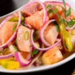 Origem peruana , salmão, camarão, polvo, marinado em suco de limão, azeite, cebola roxa, cebolinha, sal e pimenta.