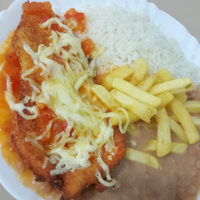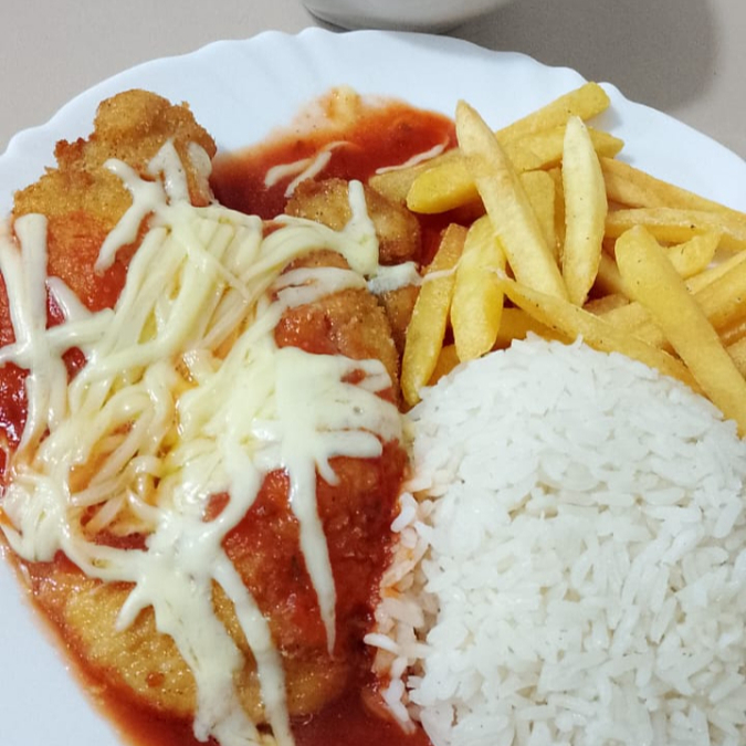 Filé de tilápia, molho de tomate, queijo, arroz, feijão e batata frita