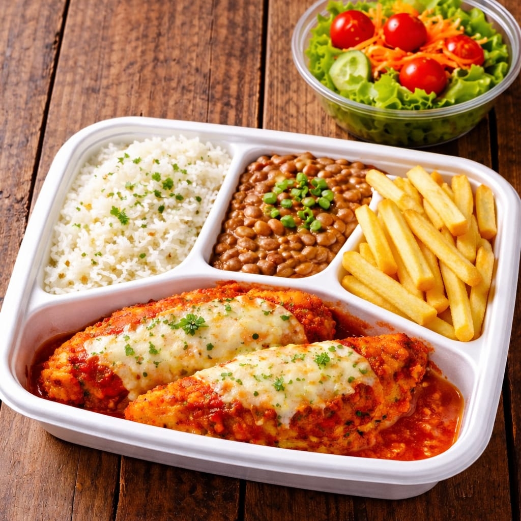 Filé de frango, molho de tomate, queijo, arroz, feijão e batata frita