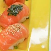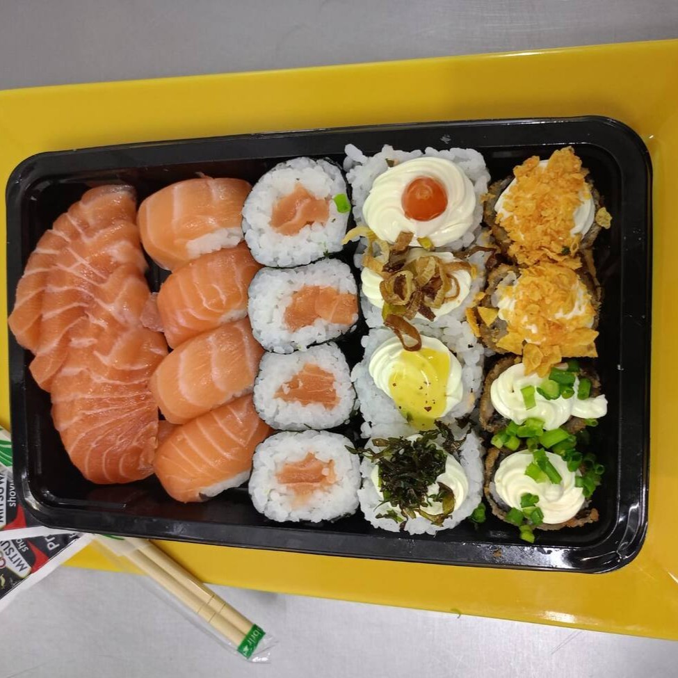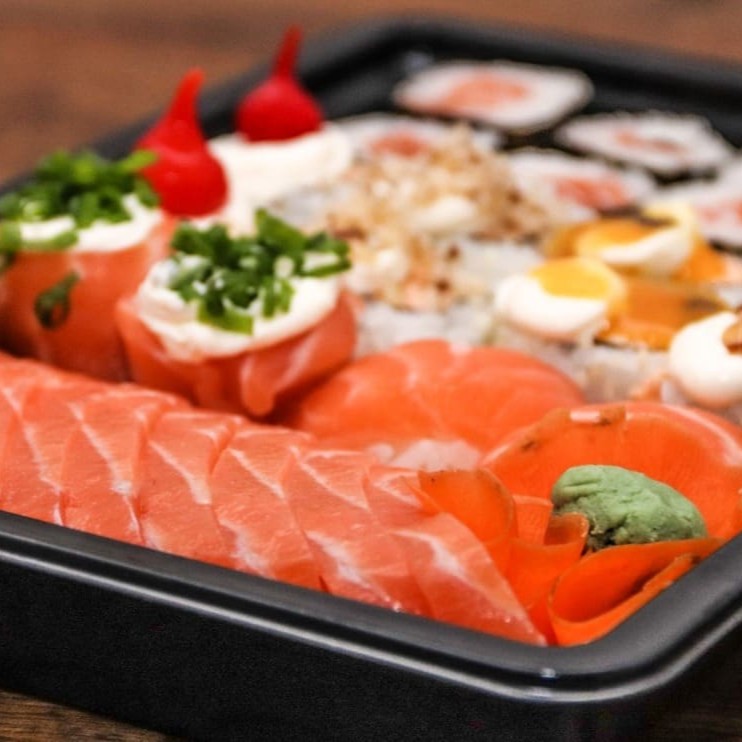10 sashimis de lombo de salmão 2 jyos de salmão 2 niguiris de salmão 8 uramakis Philadelphia 8 hossamakis de salmao