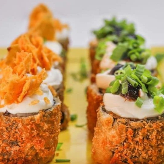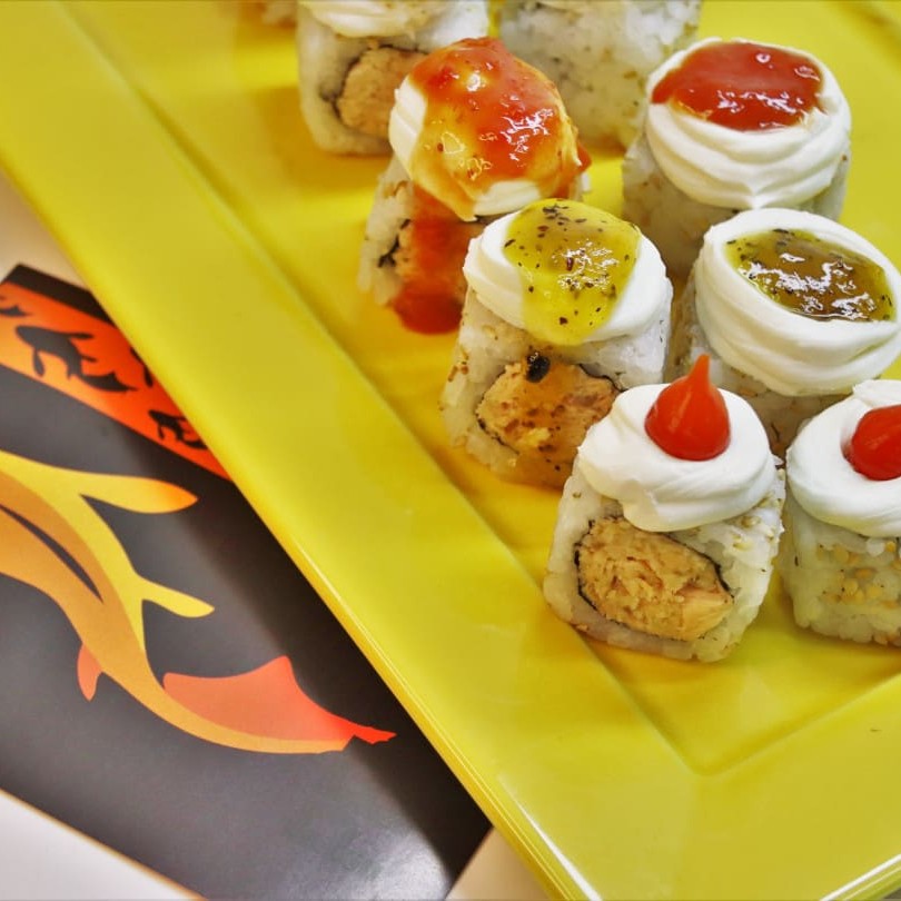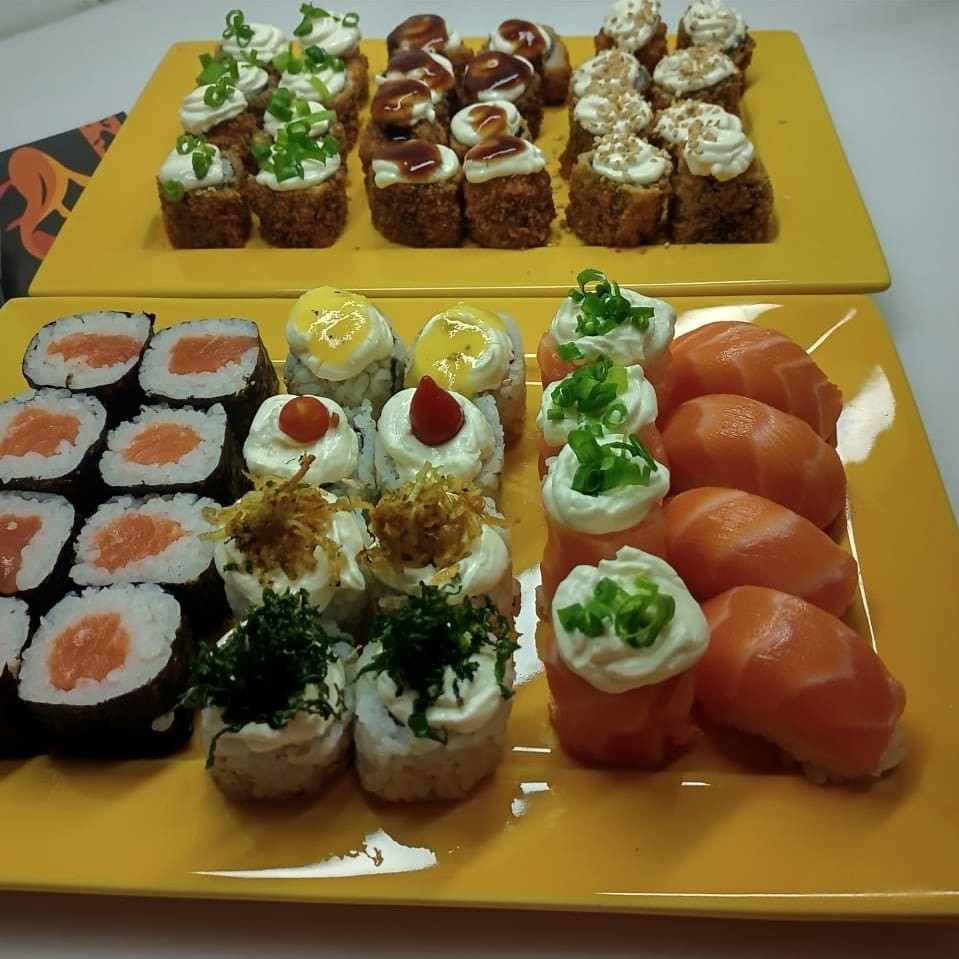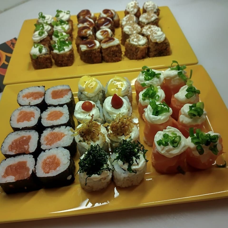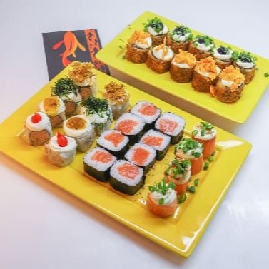 4 jyos 8 uramaki grelhado com coberturas variadas,8 hossomaki de salmao fresco e 10 hots tradicional