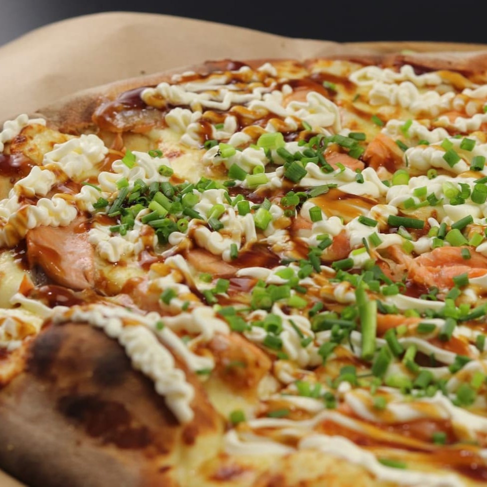 Massa artesanal recheada de mussarella salmao grelhado,creem chease,tare e cebolinha pizza com 8 fatias