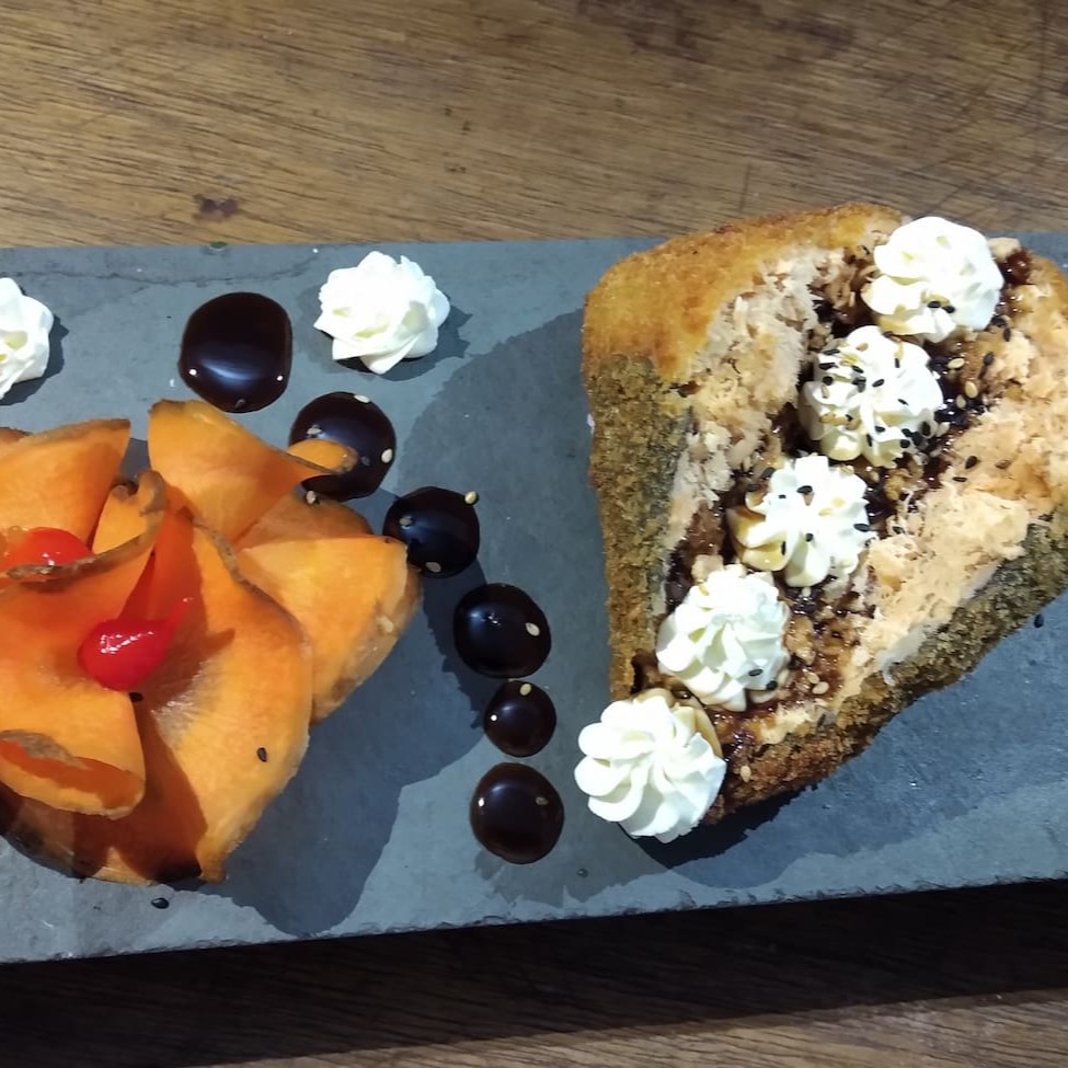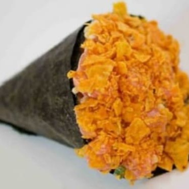 Temaki com recheio de arroz temperado com biquinho,pimenta,Doritos ,recheado de salmao grelhado e creem chease