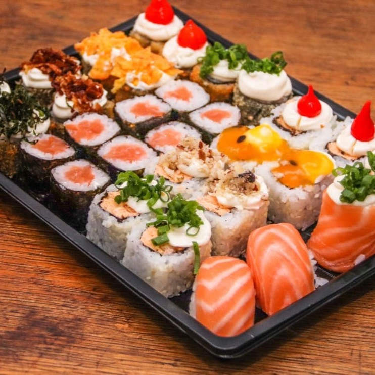 1 niguiri 1 jyo 4 uramaki grelhado com coberturas variadas 4 hossomaki e 5 hots tradicinonal