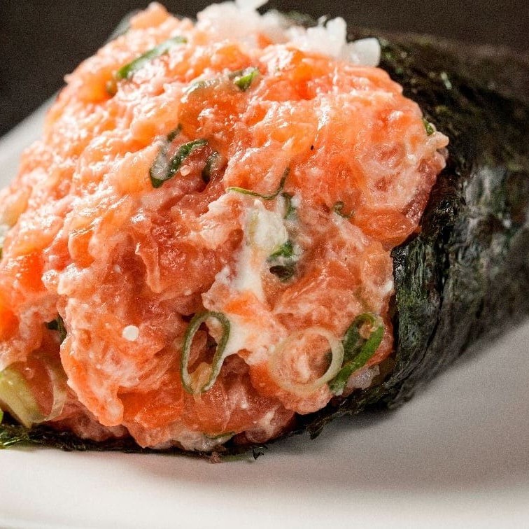 Temaki recheado de cubos de salmao frito com creem chease e cebolinha