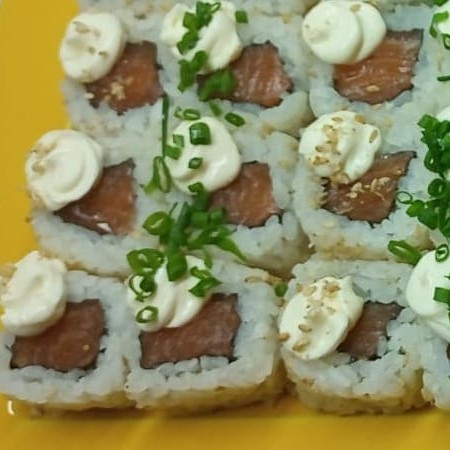 24 péças de uramakis de salmao fresco com cobertura de creem chease e cebolinha