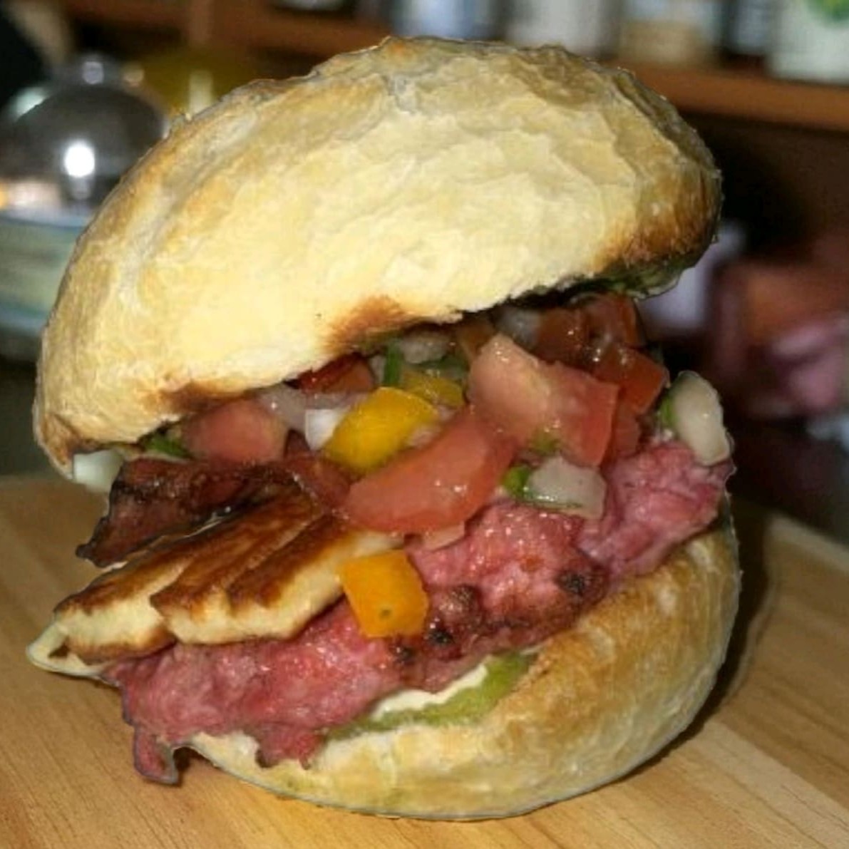 Lanche artesanal feito na brasa com blend de fraldinha 150g, fatias de bacon, queijo prato, cream cheese, geleia de pimenta e cebola caramelizada no pão australiano. Um sabor agridoce marcante que surpreende a cada mordida!
