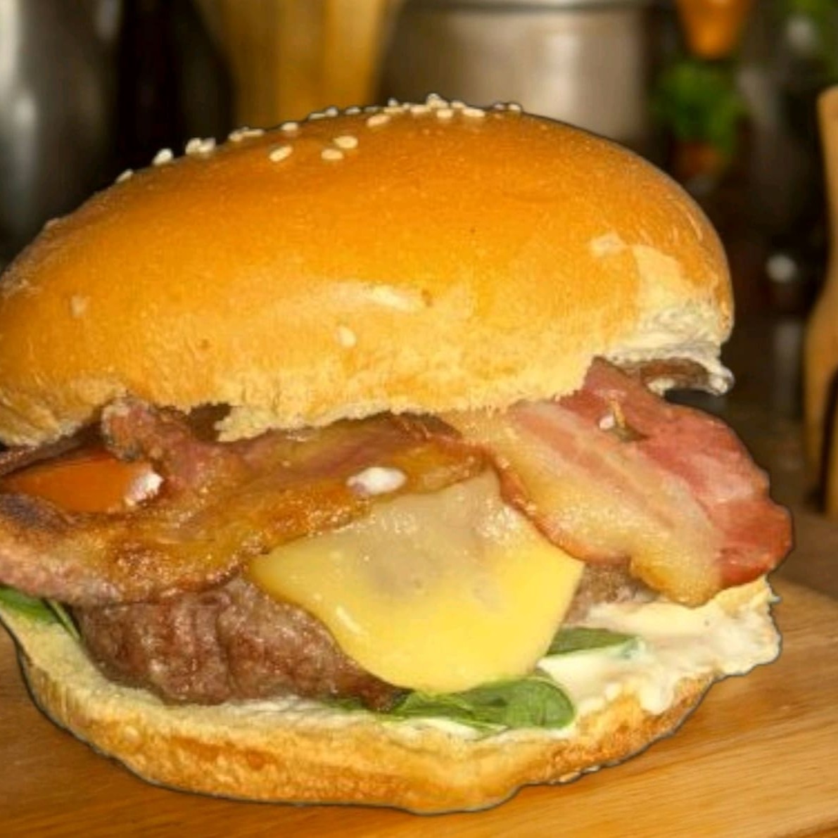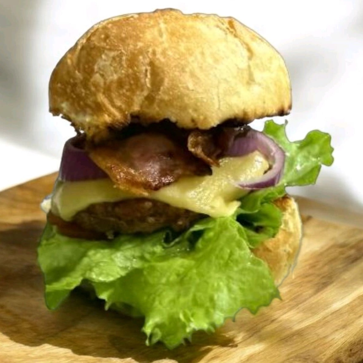 Um lanche com personalidade! Feito com um suculento blend artesanal de 150g defumado na brasa, queijo provolone derretido, tomate chapeado, rúcula fresca, bacon crocante e nossa maionese especial da casa. Tudo isso no pão da sua escolha, pra deixar o sabor do seu jeito.