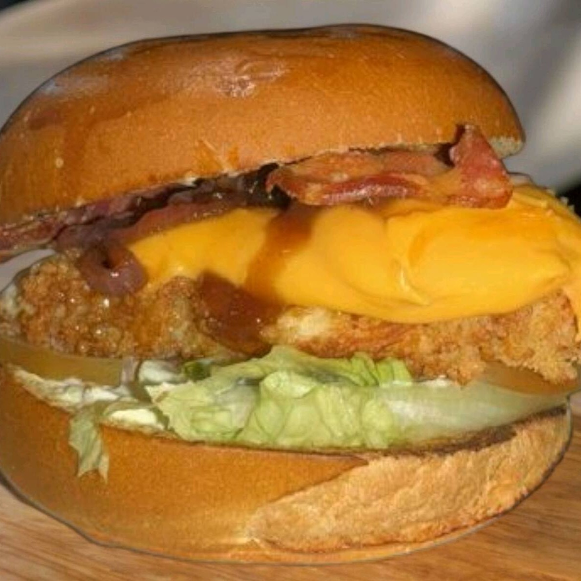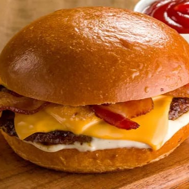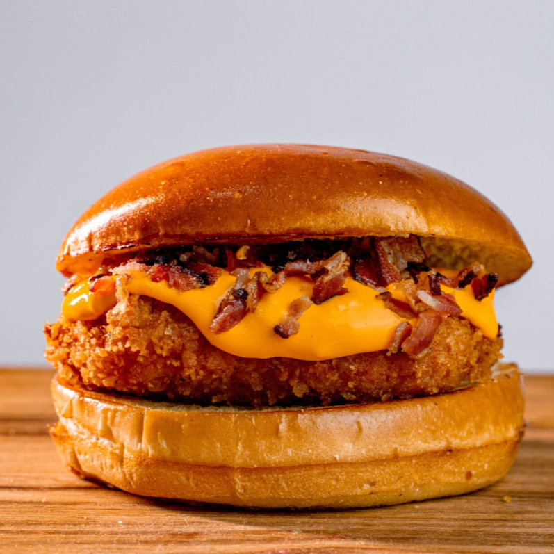Um lanche irresistível com frango empanado douradinho, cheddar cremoso derretido, alface fresca, tomate suculento, cebola caramelizada e bacon crocante, tudo isso no pão da sua escolha. Uma combinação perfeita de texturas e sabores que vai te conquistar!