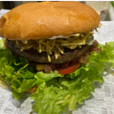Hambúrguer , ovo , milho , batata palha , milho alface e tomate.