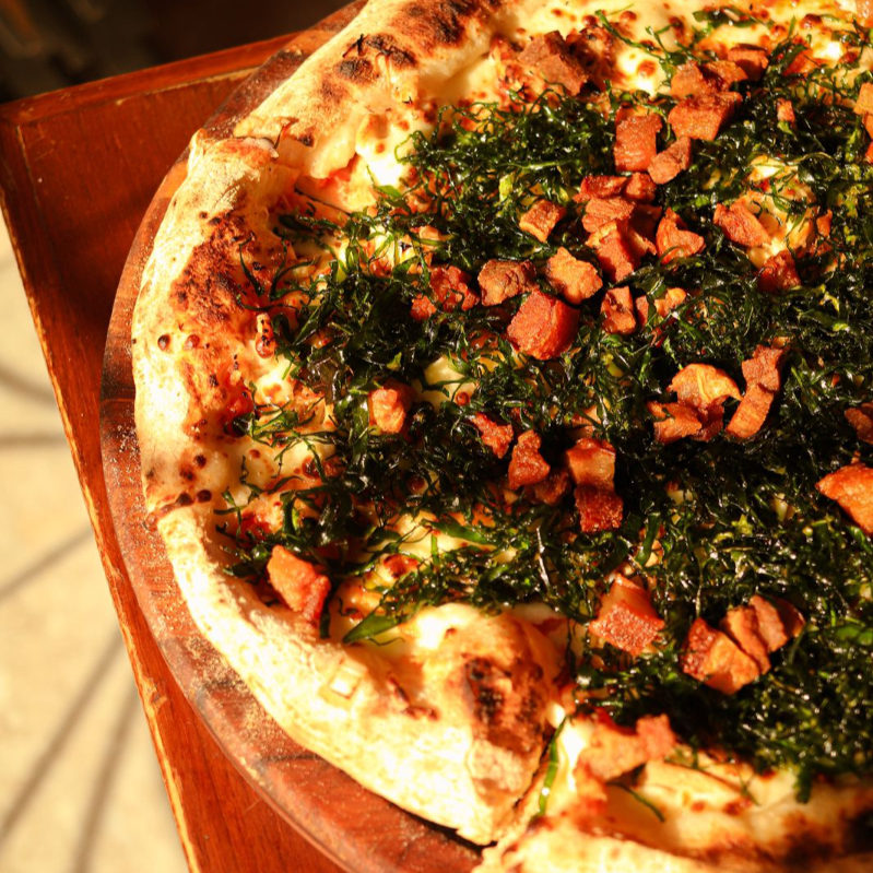 Ovo caipira, bacon, parmesão e pimenta-do-reino.