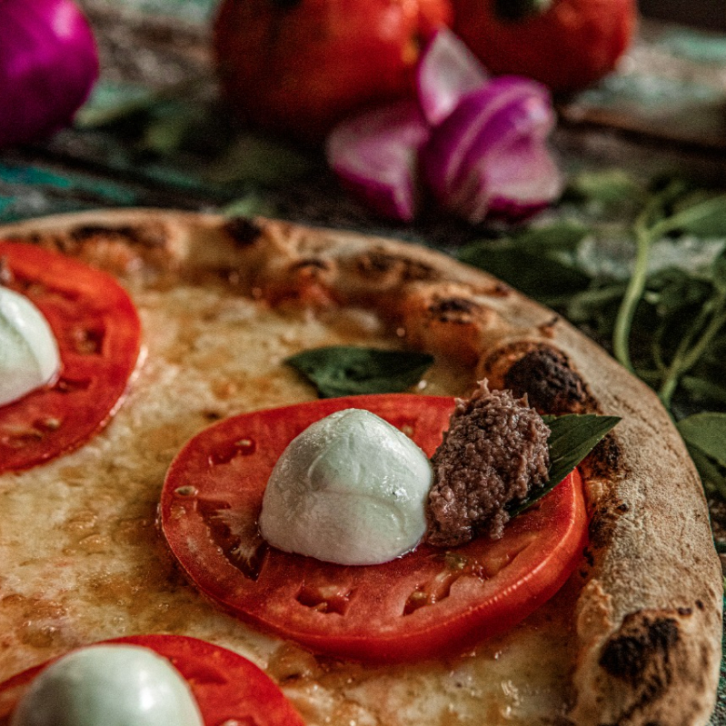 Tomate caqui, Muçarela de Búfala, Pesto de Azeitonas, Manjericão e Rúcula.