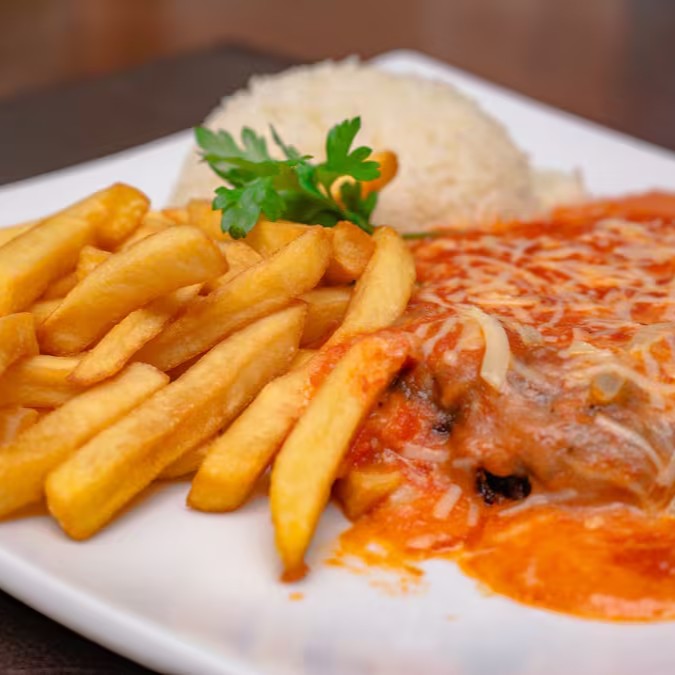 Acompanha arroz branco e fritas. Obs: Não fazemos trocas de ingredientes.