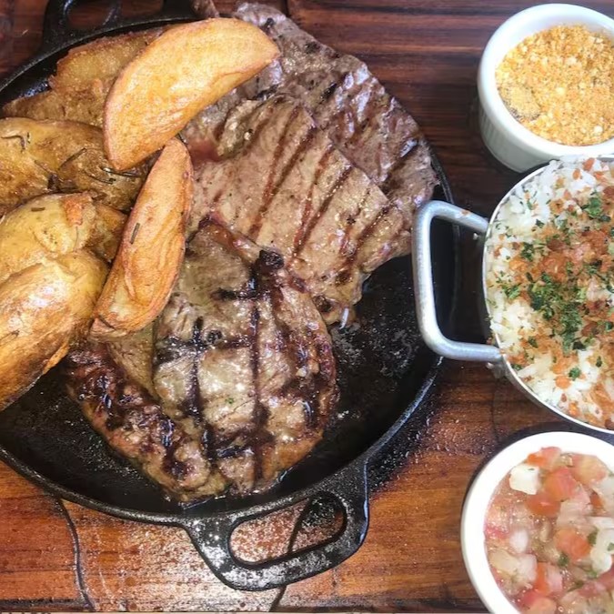Acompanha arroz caipira (bacon, ovo, couve e calabresa), batatas rústicas, farofa e vinagrete.