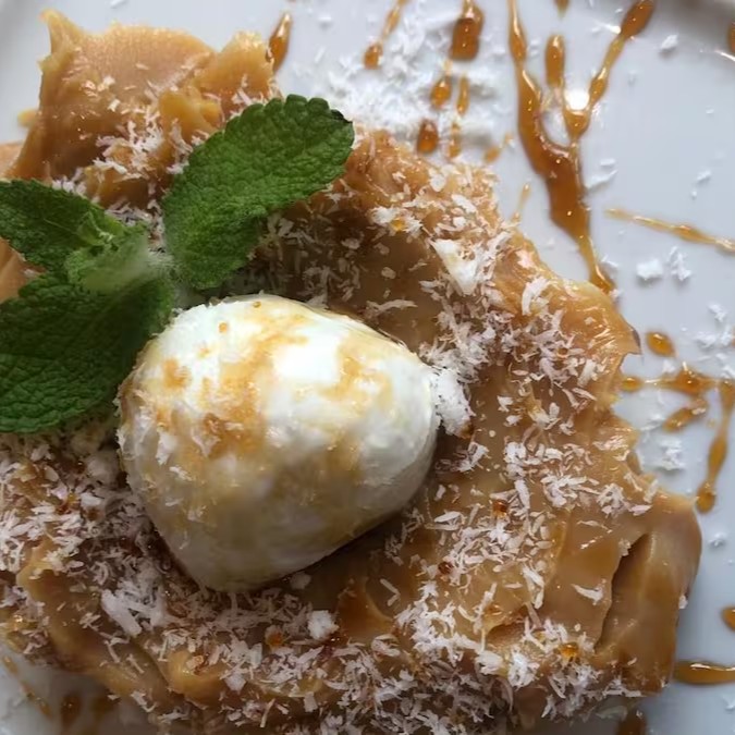 Doce de leite, mussarela de búfala, salpicado com côco ralado e cobertura de caramelo. Obs: Não fazemos trocas de ingredientes.