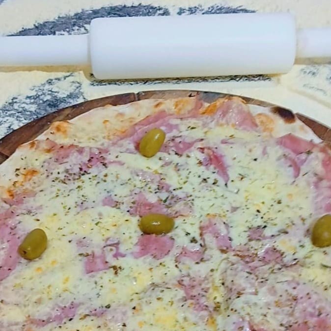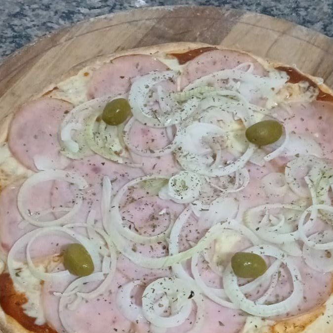 Massa Fresca Artesanal Coberta Com Molho de tomate, presunto fatiado, mussarela, Orégano e Azeitonas