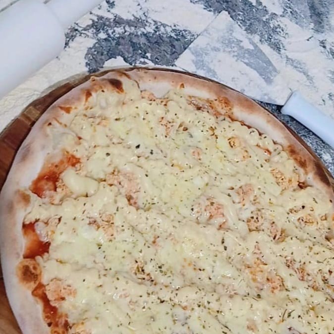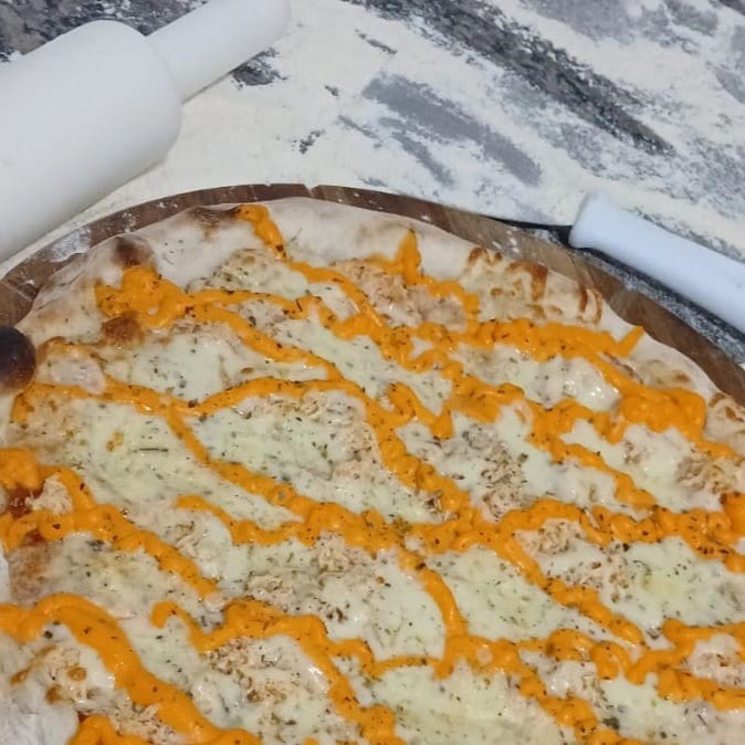 Massa Fresca Artesanal Coberta Com Molho de tomate, Frango Desfiado Temperado, Mussarela Catupiry Orégano E Azeitonas