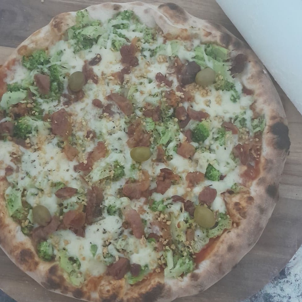 Molho de tomate, mussarela, brocolis, Catupiry, bacon em cubos, alho frito, orégano e azeitonas