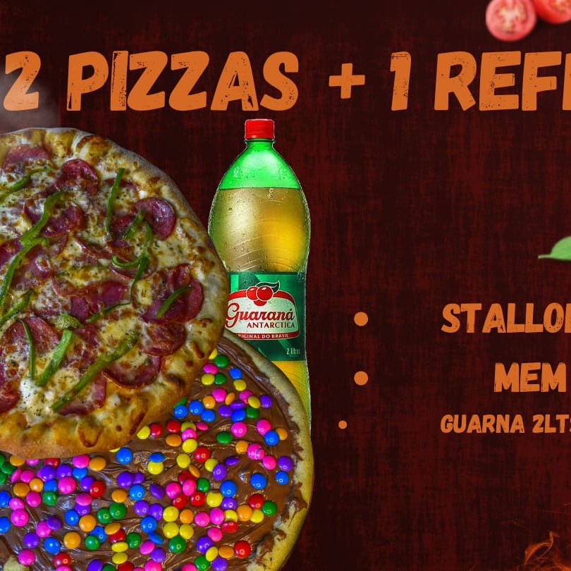 Duas Pizzas Grandes + 1 Guaraná Antartica 2lts - Stalone (Mussarela,Salame,Calabresa,Provolone,Pimentao) - Mem (Chocolate ao Leite, Avelã e Confetes) - Guaraná Antartica 2lts