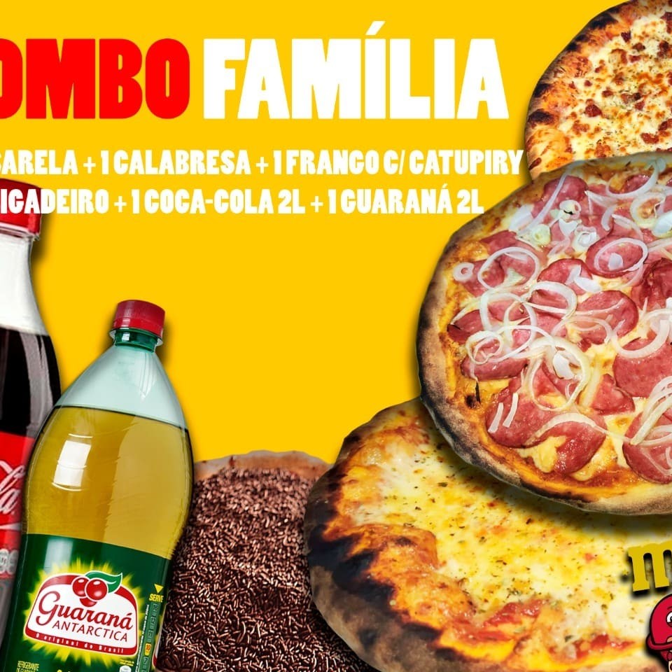 Três deliciosas pizzas salgadas e uma doce e dois refrigerantes de dois litros conforme descrição :) 1 Mussarela 1 Calabresa 1 Frango com Catupiry 1 Brigadeiro 1 Coca 2lts 1 Guaraná 2lts