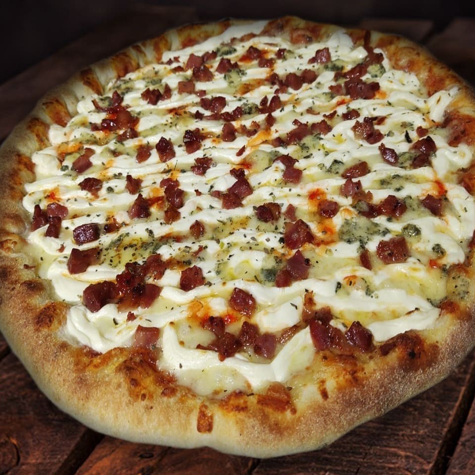 Molho de tomate da casa, mussarela, filé de frango desfiado e temperado, requeijão scala, bacon, geleia de pimenta caseira e orégano.