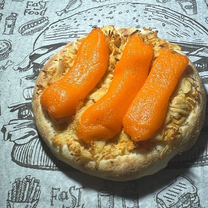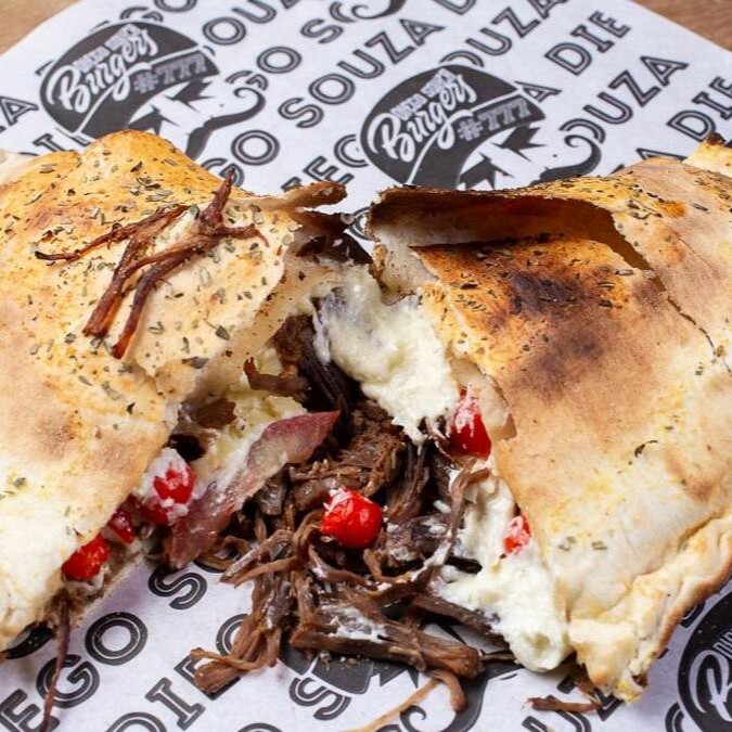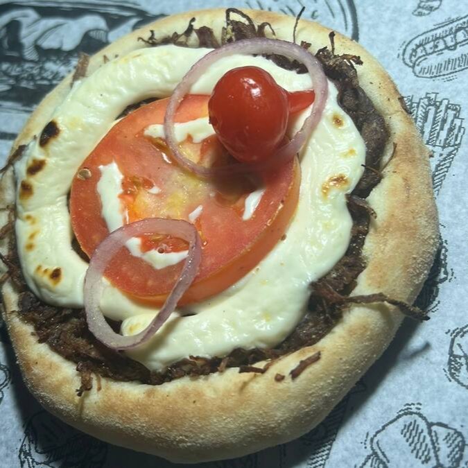 Mussarela, costela desfiada, tomate, cebola, cream cheese, orégano e azeitonas verdes sem caroço.