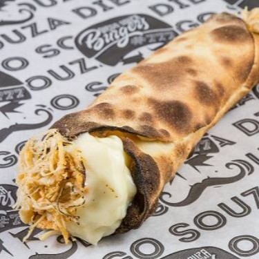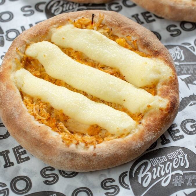 Mussarela, frango desfiado, bacon, Catupiry e azeitonas verdes sem caroço.
