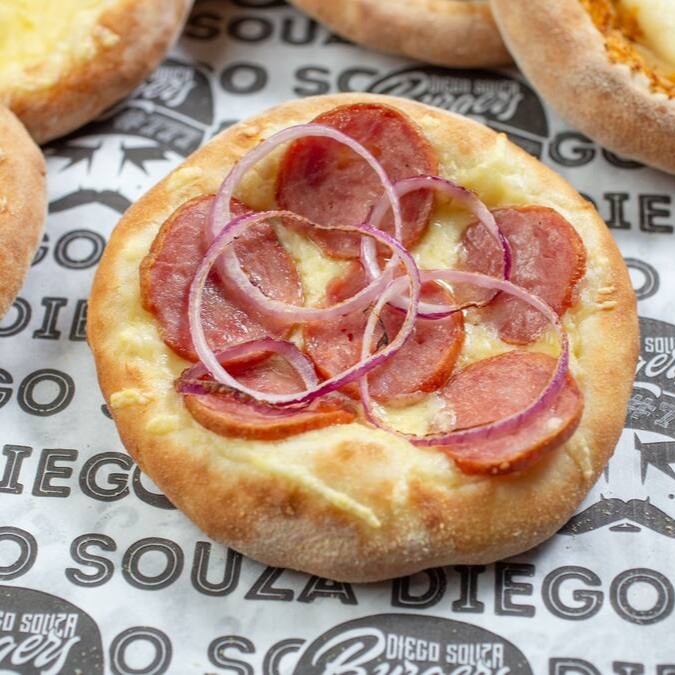 Molho de tomate, mussarela, calabresa, cebola, orégano, e azeitonas verdes sem caroço