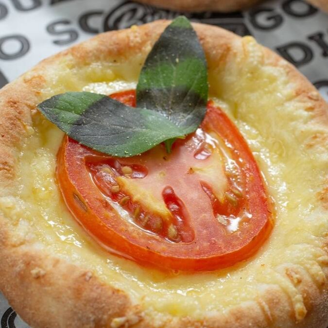 Molho de tomate, mussarela, parmesão ralado, tomate, manjericão e azeitonas verde sem caroço