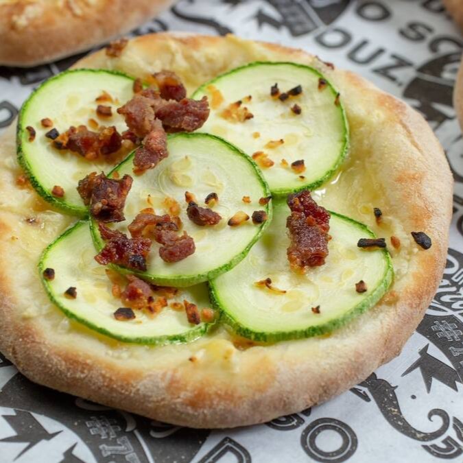 Molho de tomate, mussarela, abobrinha fatiada gratinada, bacon, orégano e azeitonas verdes sem caroço