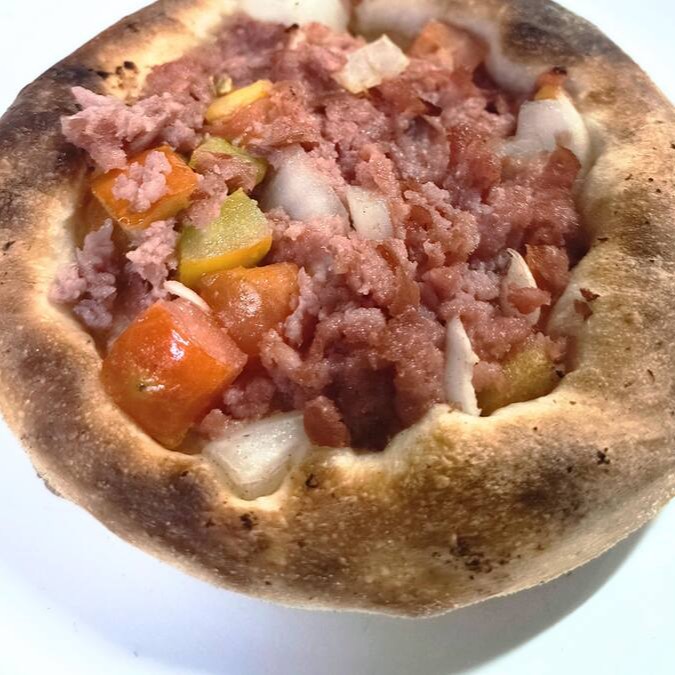 Calabresa, tomates e cebolas em cubos finalizada com cheddar